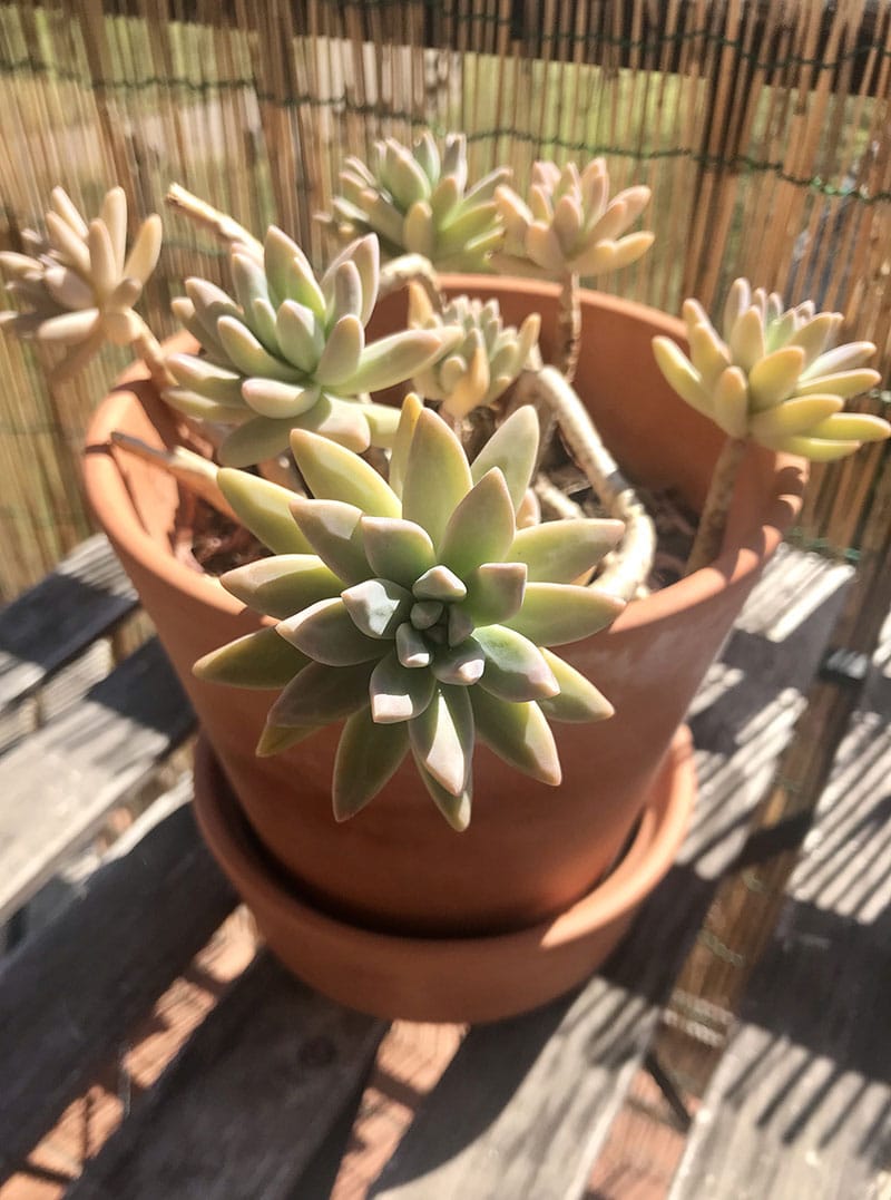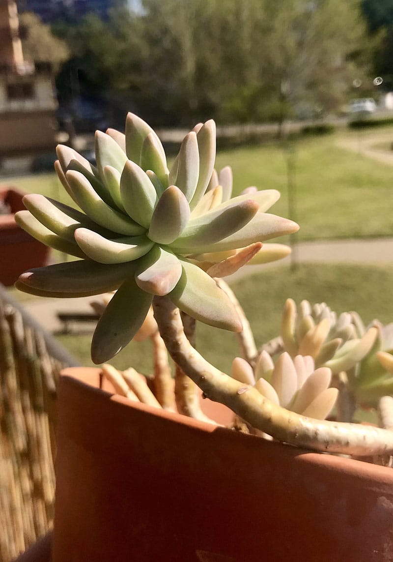 Il Graptosedum è formato da rosette che possono arrivare a circa 12-14 cm di diametro e che crescono alle estremità di steli medio-lunghi. Una pianta sana ha rosette fitte e steli che tendono a cadere verso il basso, creando una bellissima cascata. Il colore delle foglie varia dal verde-grigio ai toni del rosa in base alla stagione e all’esposizione al sole.